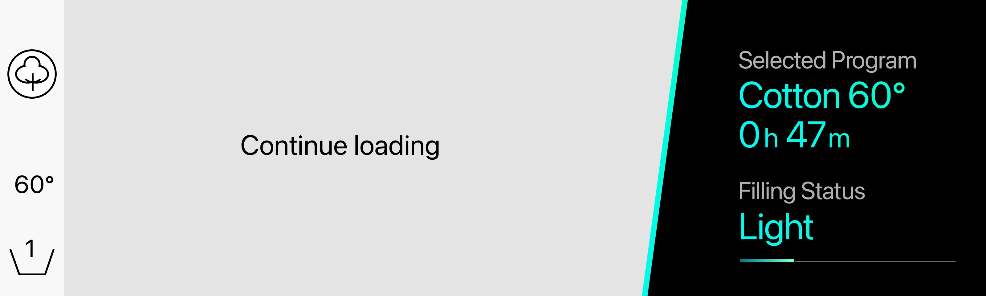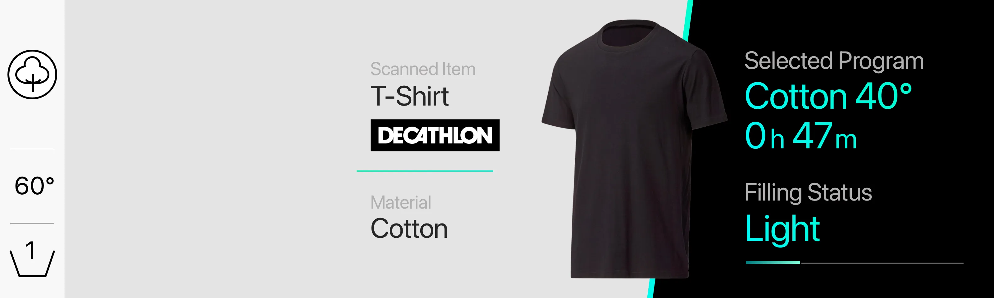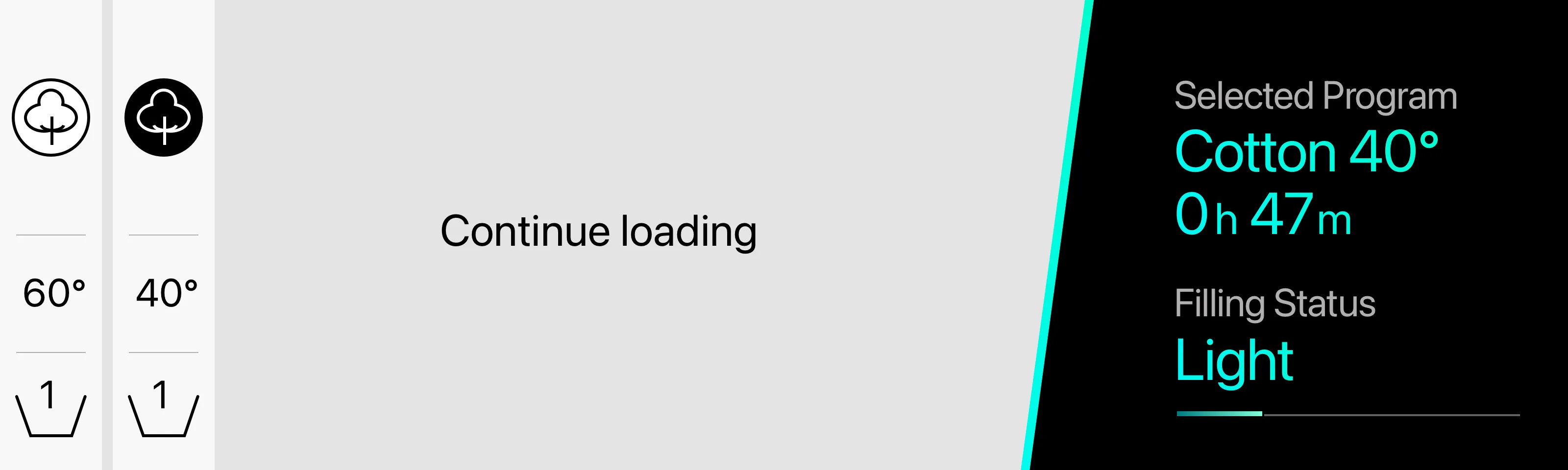 The main interface focuses on a single, central visualization of the wash. It detects filling level, fabric type and load composition, and the display estimates washing time dynamically, based on the actual load. It also indicates the optimal filling ratio, helping users avoid over- or under-loading, and automatically suggests the appropriate washing cycle rather than asking users to choose from dozens of programs, the system adapts to what’s inside the drum.