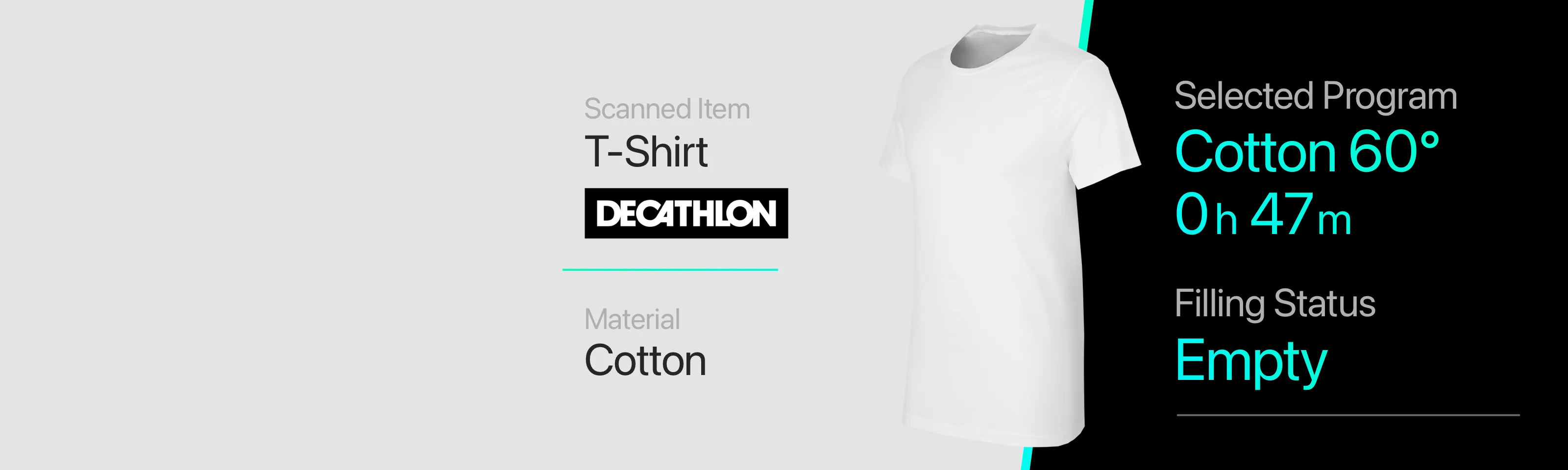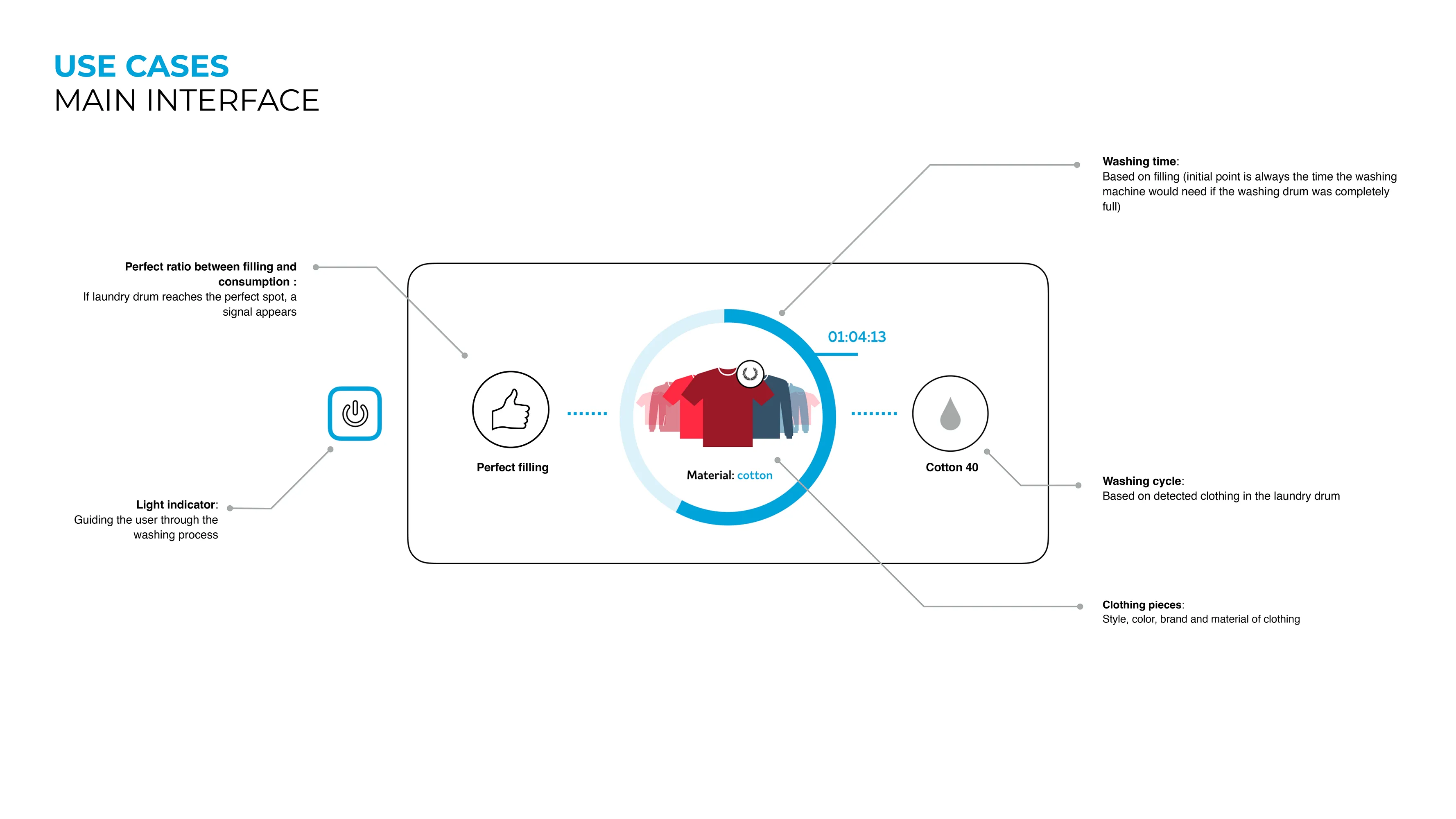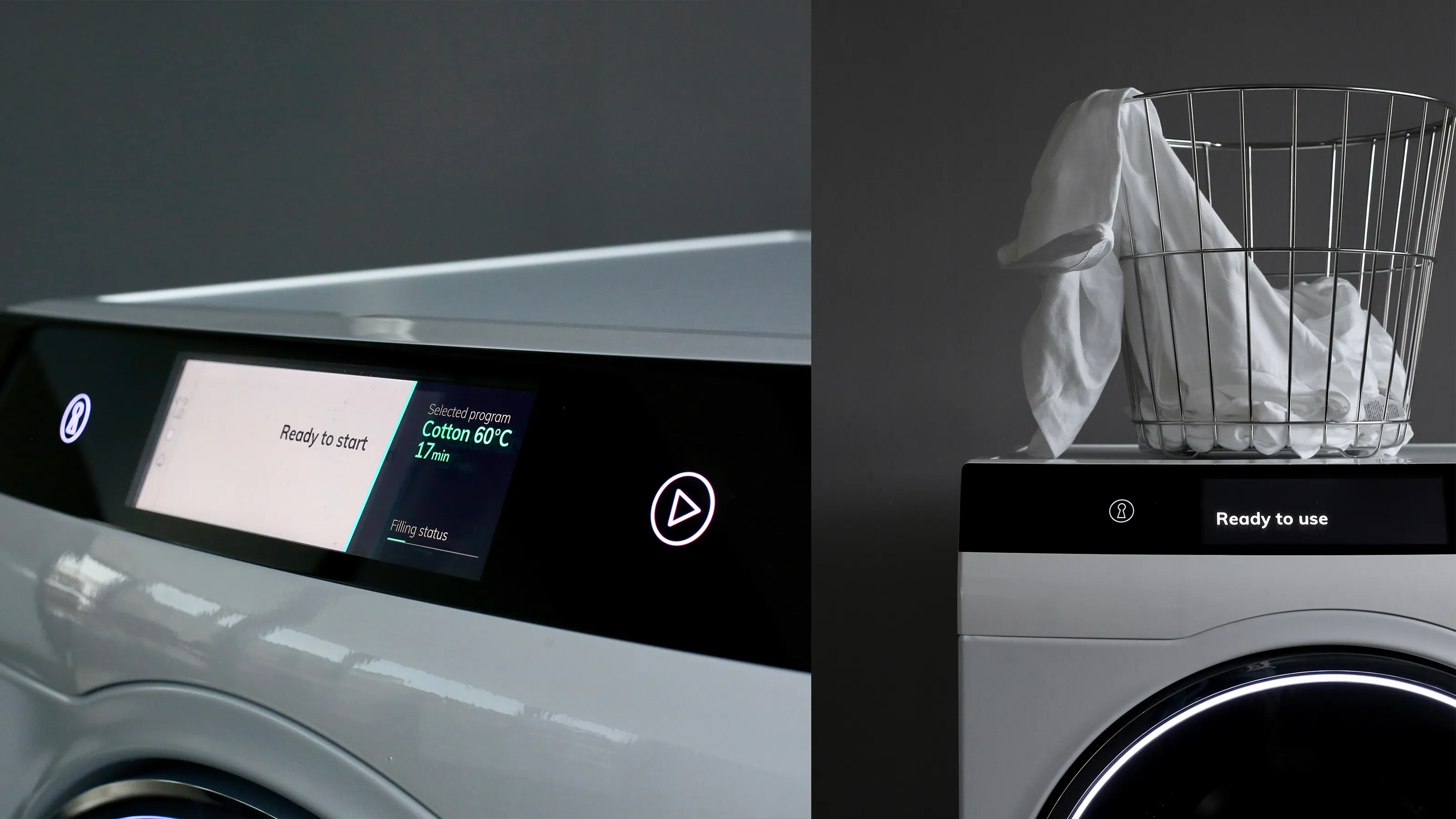 The main interface focuses on a single, central visualization of the wash. It detects filling level, fabric type and load composition, and the display estimates washing time dynamically, based on the actual load. It also indicates the optimal filling ratio, helping users avoid over- or under-loading, and automatically suggests the appropriate washing cycle rather than asking users to choose from dozens of programs, the system adapts to what’s inside the drum.