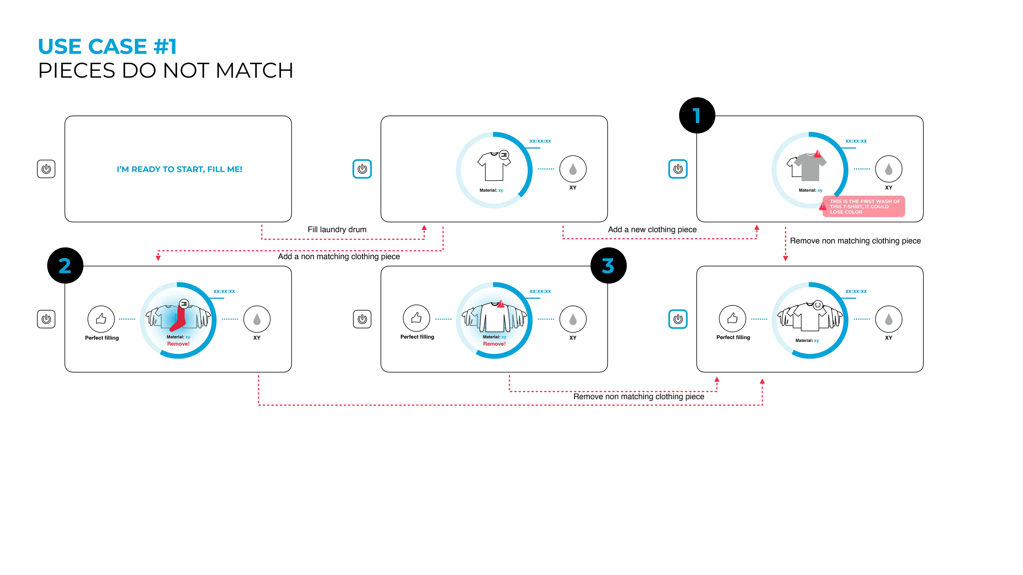 The interface concept centered on clarity, guidance and emotion. The design used light indicators and simple iconography to guide users through each stage of the washing process. Iterations explored two visual directions, from the garments vocabulary, “Stacking” and “The Label”. The interface balanced technical intelligence with visual warmth, reinforcing D[AI]TA’s mission to make technology approachable and sustainable.