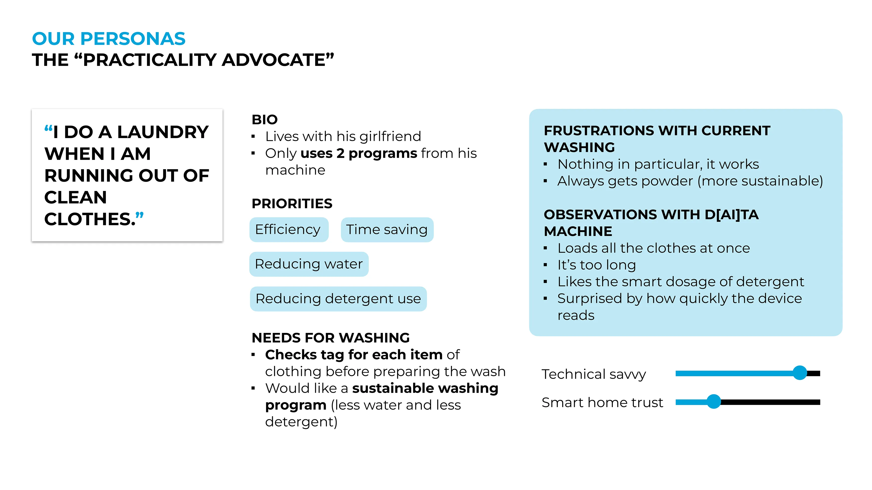 To understand how people actually do laundry, we used a mix of user interviews and competitive analysis of existing washing machine interfaces. Based on research patterns, we also developed personas representing different relationships with laundry: the practicality advocate, the eco-conscious consumer, the careful skeptic and the unafraid home enthusiast.