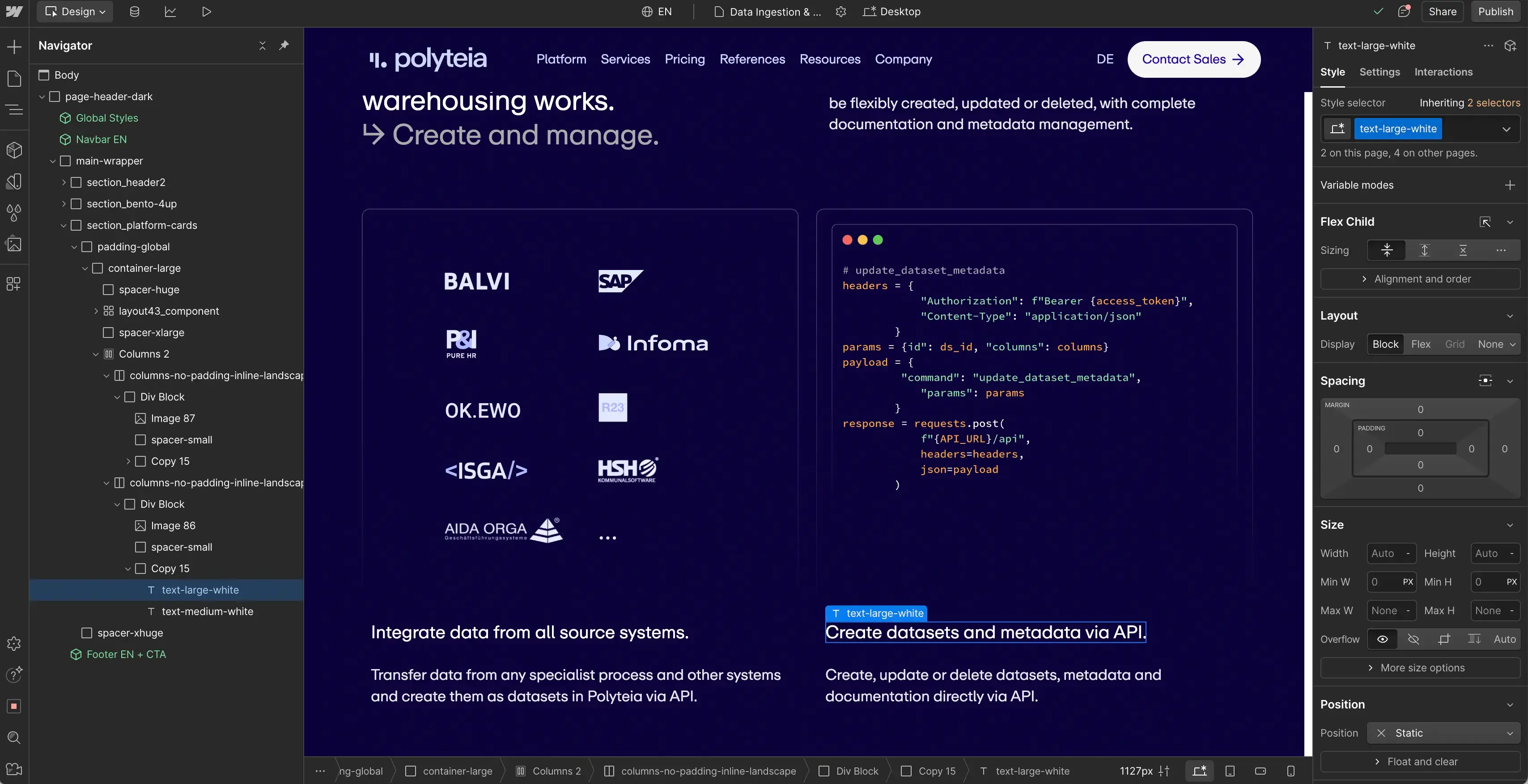 Polyteia required a refreshed online presence to clearly communicate their data-and-workflow platform for public administrations. The task was to refresh the landing pages and implement them in Webflow, in a way that speaks to two very different audiences (administrative leaders + IT/development teams) while maintaining brand consistency, clarity, and visual appeal. The challenge was to align complex content (data modules, workflows, APIs) into a clean, approachable interface, ensure smooth Webflow responsiveness, and deliver a cohesive experience that supports lead conversion and brand credibility.